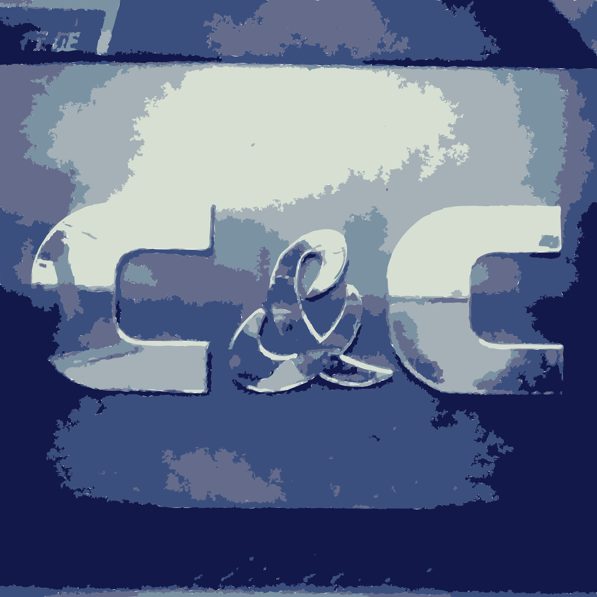 This is a blue and white photo of a metal sign with the letters C, C, & C on it. The sign appears to be made of metal or plastic, giving it a reflective quality. The background of the image has a slightly blurred appearance, which adds depth to the scene. Overall, the image showcases an interesting and unique piece of artwork that stands out against its surroundings.