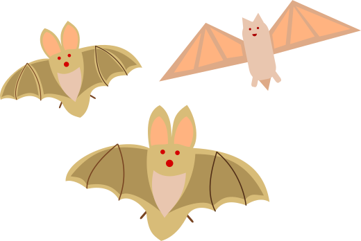 This features a group of three cartoon bats, each with different characteristics. One bat is brown and white, while the other two are brown and pink. They appear to be flying in the air, creating an interesting visual effect. Additionally, there is a fourth bat that seems to be cut off from the main group, located towards the top left corner of the image. The bats' positions vary, with one being closer to the center, another near the bottom right, and the third one slightly above the middle of the scene.