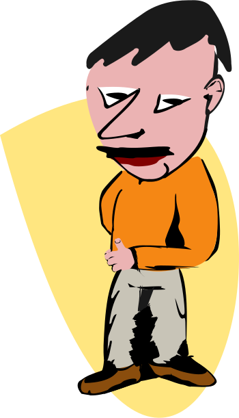 This features a man wearing an orange shirt and blue jeans. He is standing in front of a yellow background, giving the impression that he's posing for a picture. His facial expression appears to be somewhat strange or peculiar, possibly due to his large eyes and the way they are drawn. The overall style of the drawing gives it an artistic and unique appearance.