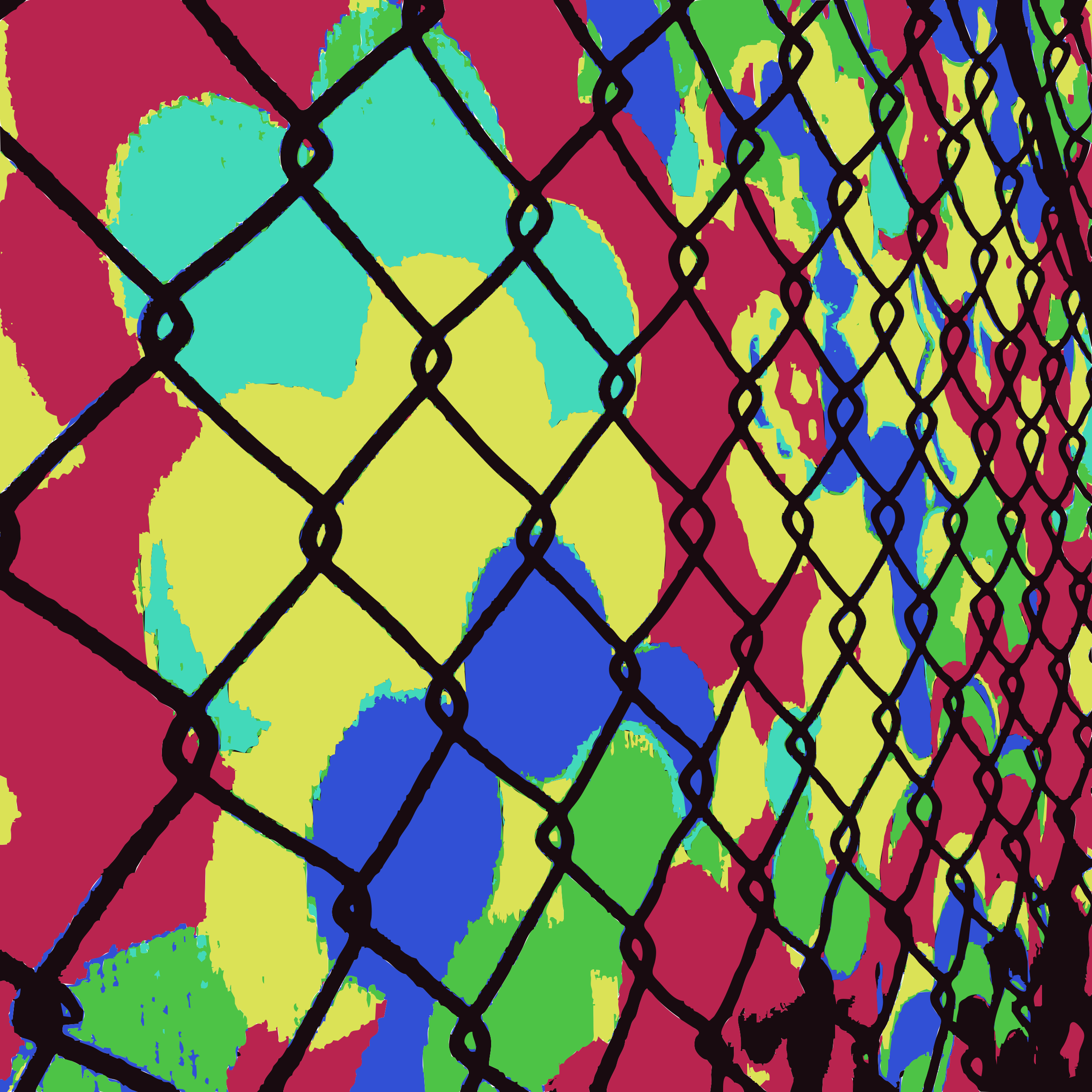 This features a chain link fence with a colorful background, creating an interesting visual effect. The fence is covered in various colors and patterns, making it stand out against the backdrop. The vibrant colors of the fence create a lively atmosphere, drawing attention to its unique design. This artistic display could be found in a public space or even as part of an art installation, adding visual interest and creativity to the environment.