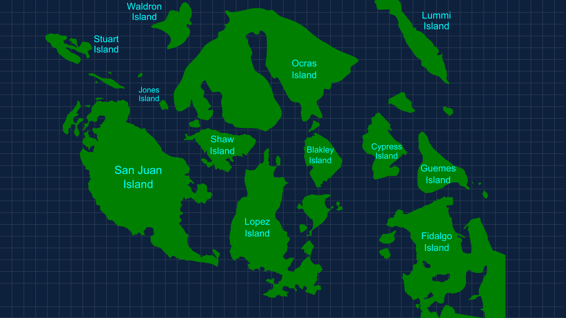 This is a map of the San Juan Islands in Washington State, near Seattle. The map features various locations such as Anacortes, Blake Island, Cattle Point, Deer Harbor, Eastsound, Friday Harbor, Lime Kiln Point, and more. The green coloring on the map indicates that it is a cartographic representation of the area. This detailed map provides an overview of the San Juan Islands, making it easy to navigate and understand the geographical layout of the region.