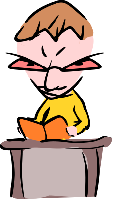 This features a cartoon character sitting at a desk, holding an orange book in its hands. The character appears to be angry and is wearing red glasses that make it look like they are on fire. The drawing has a colorful appearance with the character's face being drawn in pink and yellow colors. The desk itself is brown and occupies most of the image, giving the scene a sense of depth.