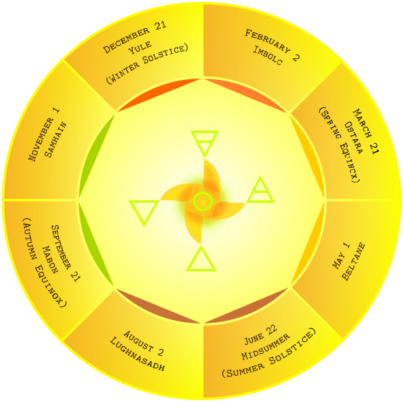 This features a circular chart with various dates and holidays displayed on it. The chart is divided into different sections, each containing a specific date or event. Some of the dates are pagan holidays, indicating that this chart may be related to a calendar for those celebrations. The chart appears to be colorful and visually appealing, making it an attractive way to keep track of important dates throughout the year.