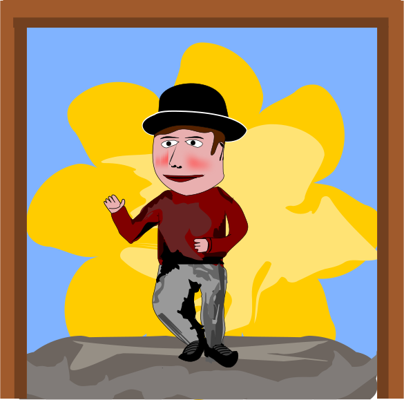 This features a man wearing a bowler hat and red shirt, standing in front of a yellow flower. He appears to be posing for the camera with his hands on his hips. The man's outfit is reminiscent of a vaudeville performer or an old-timey entertainer. The scene has a whimsical and playful atmosphere, as if it were part of a children's storybook or a comic strip.