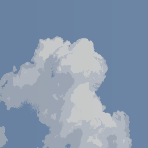 This features a cloudy sky with large, fluffy clouds scattered throughout the scene. These clouds are of various sizes and shapes, creating an interesting visual effect in the blue sky. Some of the clouds appear to be closer to the viewer while others seem further away, giving depth to the overall composition. The cloud formation is reminiscent of a painting or drawing, adding a unique artistic touch to the scene.