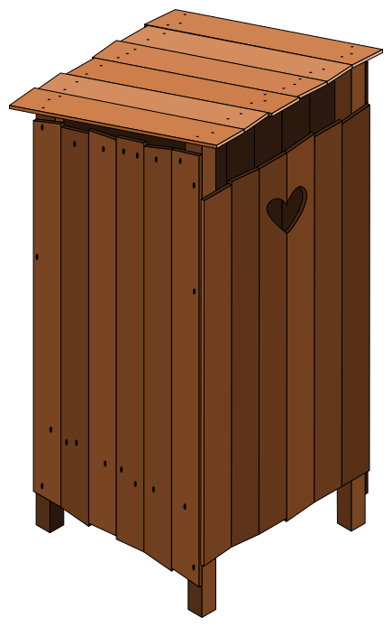 This features a wooden structure with a heart-shaped door, which is likely an outdoor bathroom. The door has a unique design that adds character to the overall appearance of the building. The wooden construction gives it a rustic and natural look, making it suitable for various settings such as gardens or outdoor spaces.