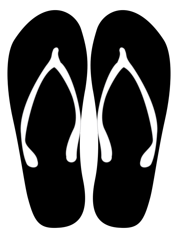 This features a pair of black flip flops, with each shoe having a white outline. These sandals are placed on top of a white background, which creates a striking contrast between the shoes and their surroundings. The flip flops have a slightly curved shape, giving them an elegant appearance. They seem to be ready for use, as they are positioned in such a way that they can easily be worn by someone who is about to step into them.