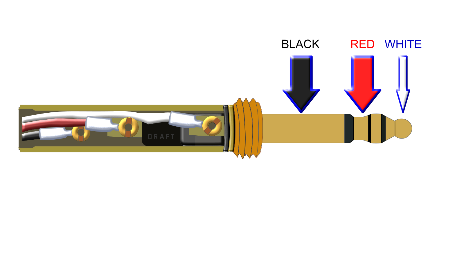 This displays a close-up view of an electronic device, likely a microphone plug. Three wires are connected to the device, with one being red, another white, and the third black. The colors of these wires indicate their respective functions in the electrical circuitry. This type of device is commonly used for various audio applications, such as recording or amplifying sound. The close-up view allows us to observe the intricate details of the plug's construction and its connection points with the other components.