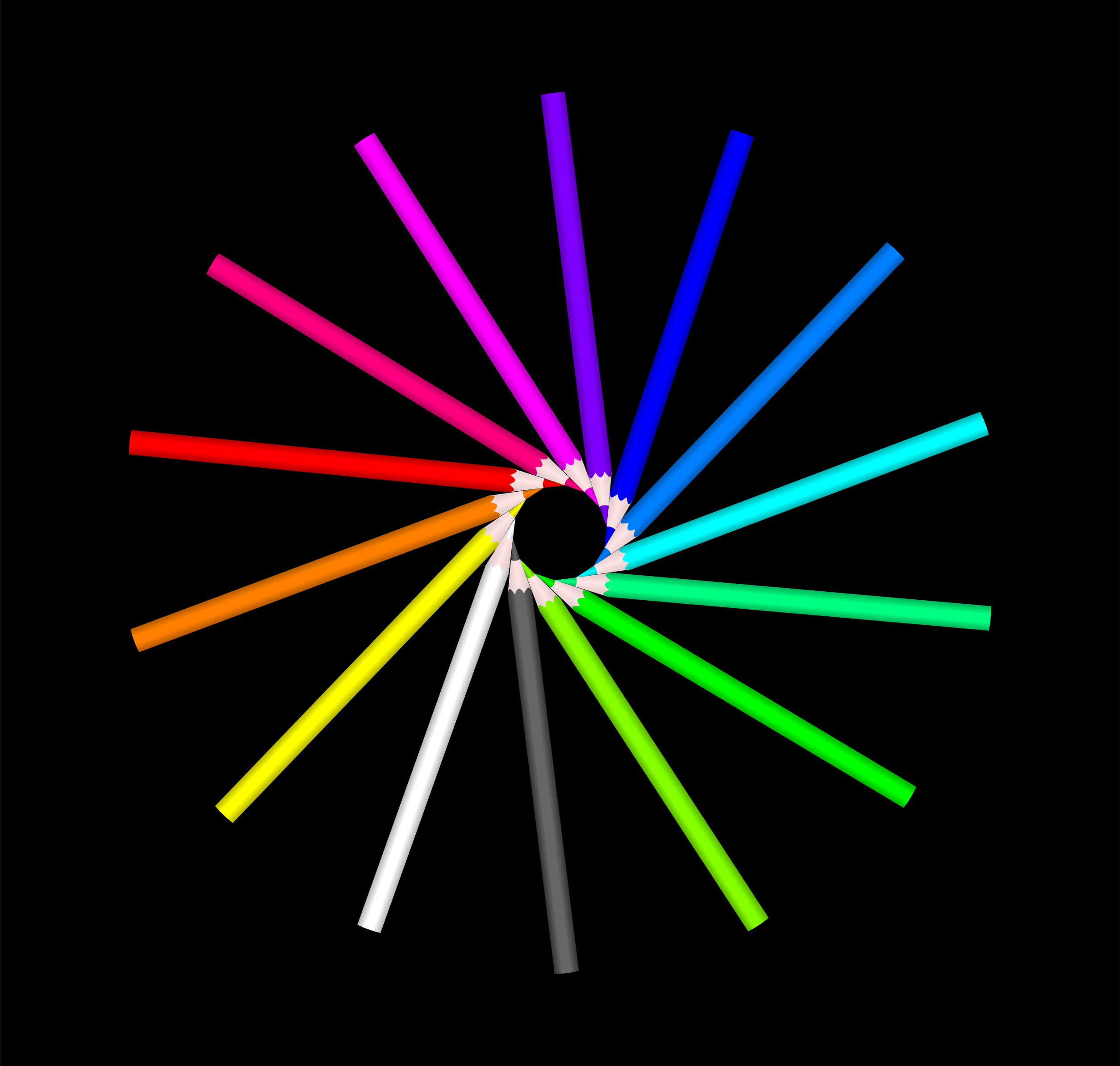 This features a colorful display of pencils arranged in the shape of a flower. There are fourteen pencils in total, each one varying in color and size. They are all lined up neatly to create an eye-catching pattern that resembles a flower. The background is black, which helps to emphasize the vibrant colors of the pencils. This unique display could be used as a creative art piece or even as a decoration for a child's room.