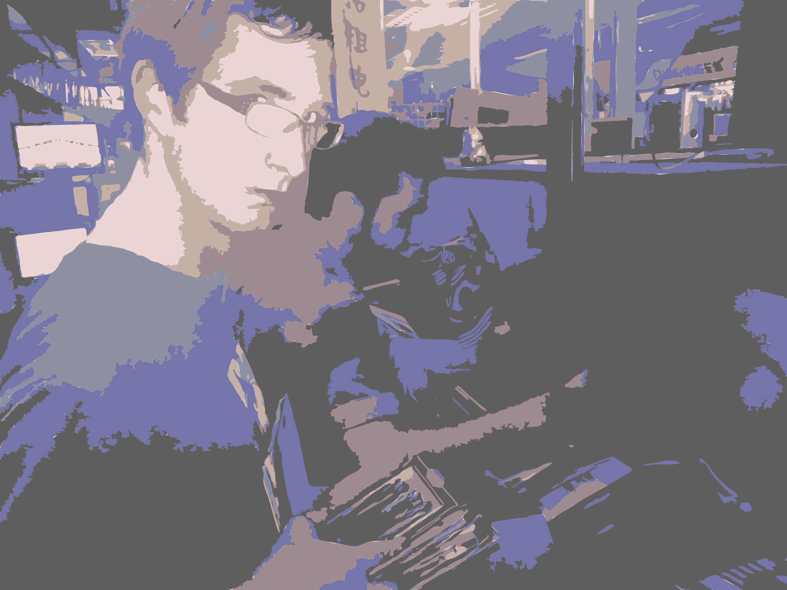 This features a man wearing glasses, standing in front of another person. They are both holding cell phones and appear to be engaged in conversation or looking at something on their devices. There is also a third person visible in the background, but they do not seem to be interacting with the main subjects. The setting appears to be indoors, possibly a store or an office environment. Various objects can be seen around them, such as a TV mounted on the wall and multiple books scattered throughout the scene. A keyboard is also visible in the background, suggesting that they might be working in a technology-related field or using their devices for work purposes.