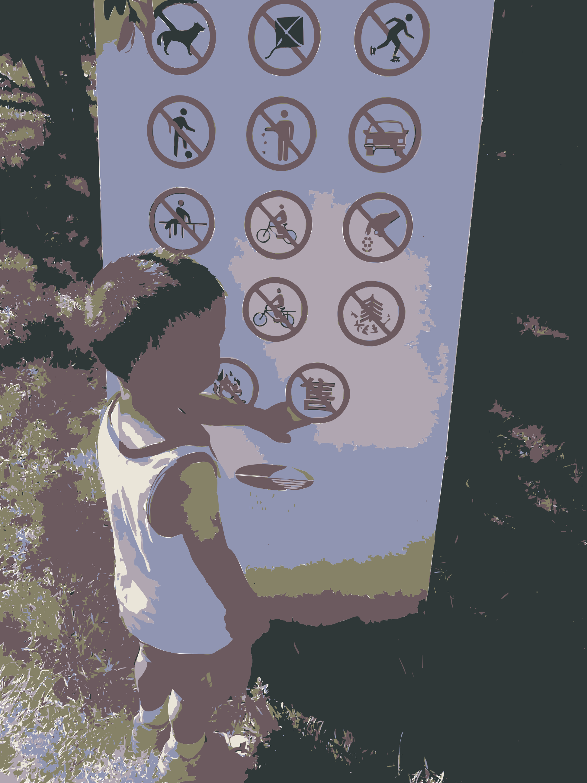 This features a young boy standing in front of a sign with various symbols on it. He appears to be pointing at one of the signs, possibly indicating his interest or curiosity about the symbols. The sign is located near some grass and trees, creating an outdoor setting for this interaction.