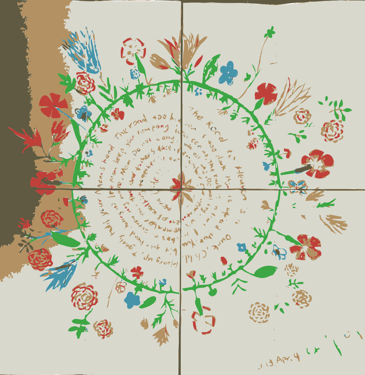 This features a large, colorful circle with a variety of flowers and plants adorning it. These decorations are arranged in a circular pattern, creating an eye-catching display. In the center of the circle, there is a message written out, likely conveying a special meaning or sentiment. The combination of the vibrant colors and intricate designs make this piece of artwork visually appealing and unique.
