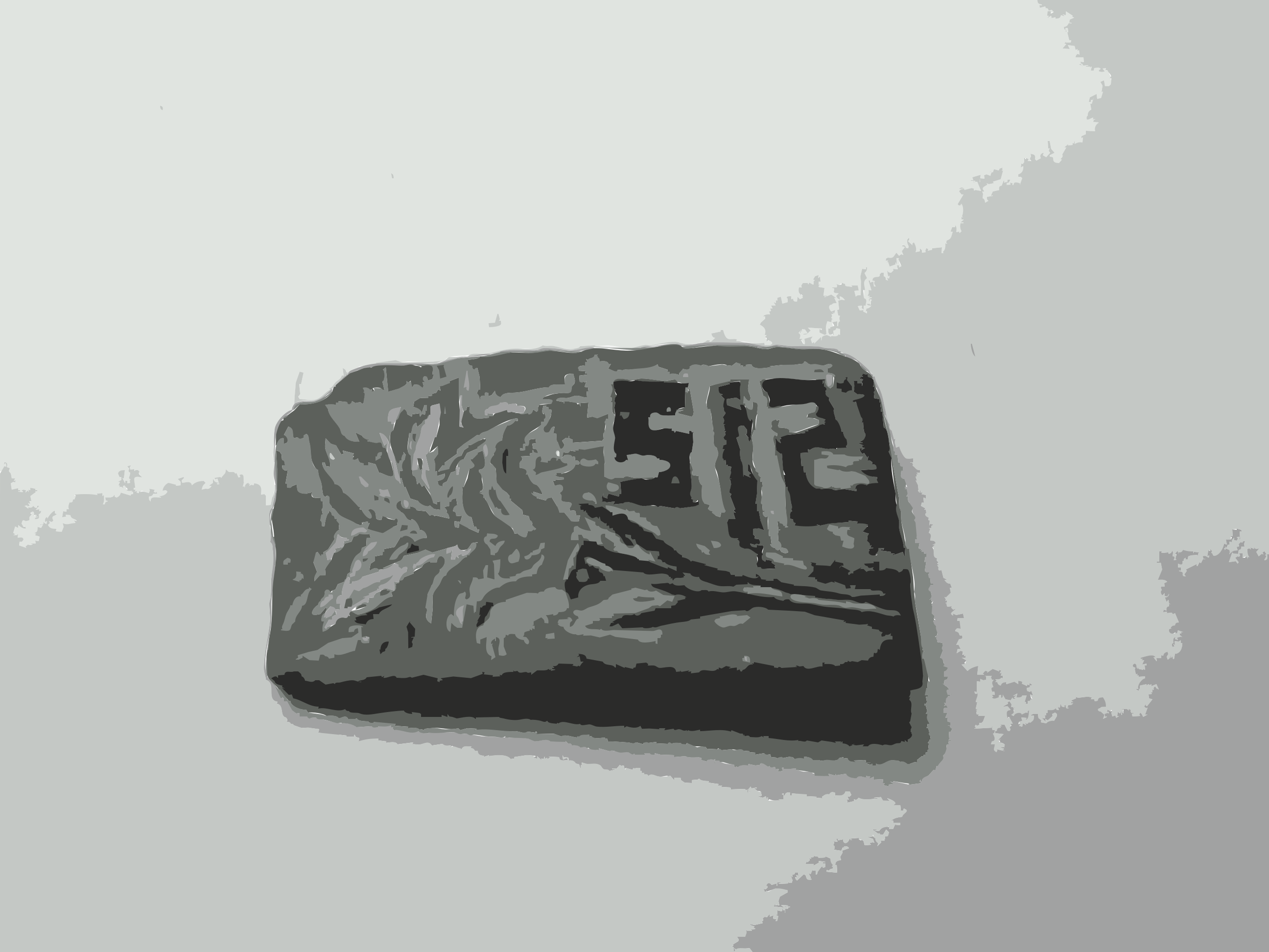 This features a small, rectangular piece of wood with an intricate design on it. The design is made up of several leaves and numbers, creating a unique pattern that stands out against the wooden surface. The piece appears to be a decorative item or possibly a piece of artwork, as its distinctive appearance suggests it may have been crafted by hand.