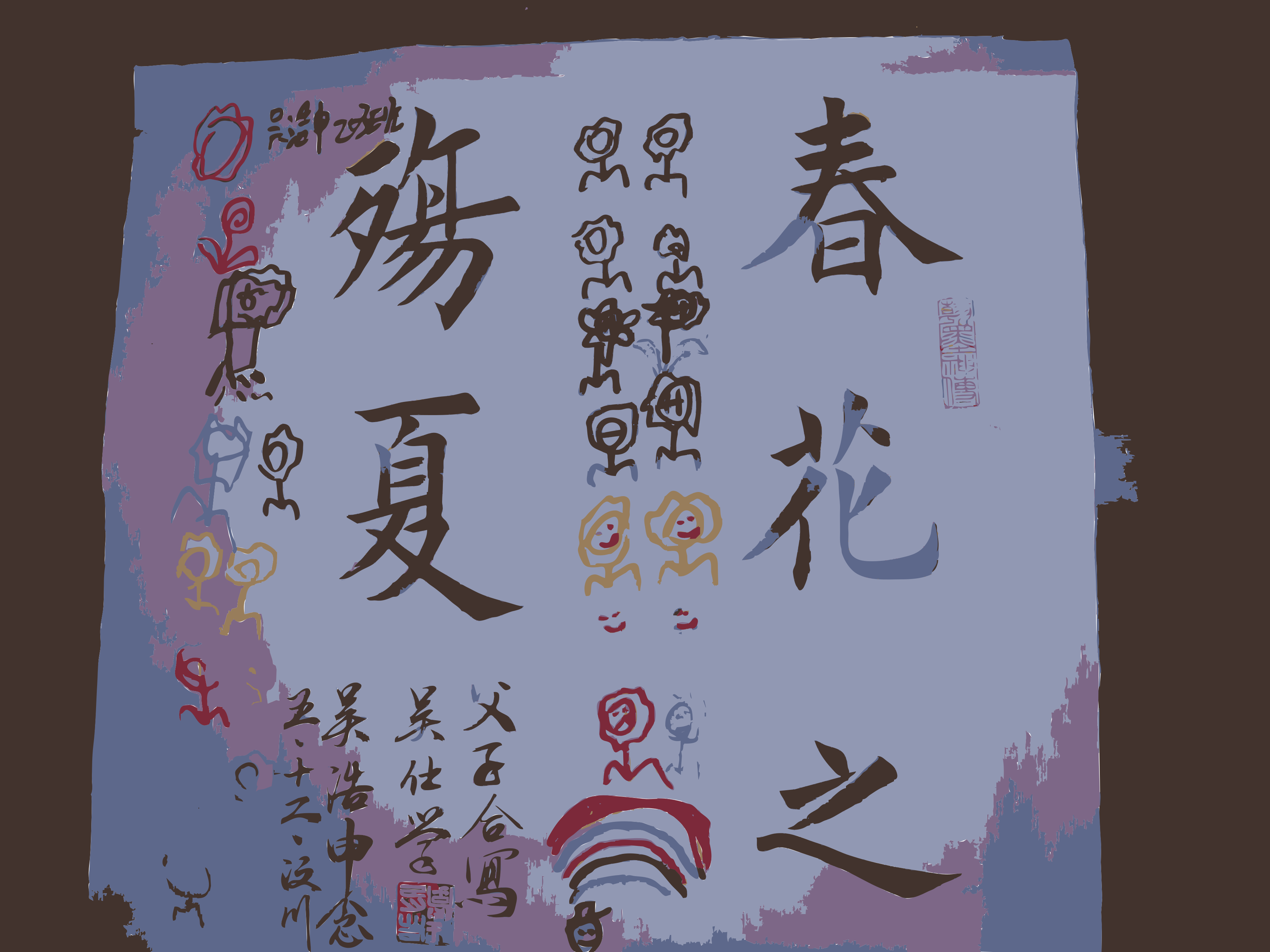 This is a piece of paper with Chinese writing on it. There are several characters written in different colors, making the text visually appealing and interesting. Some of these characters appear to be red, while others are blue or yellow. The paper also has a drawing of a person at the top left corner, adding an artistic touch to the overall presentation. This piece of paper could potentially be used for various purposes such as decoration, learning Chinese, or even as a gift with its unique and colorful appearance.