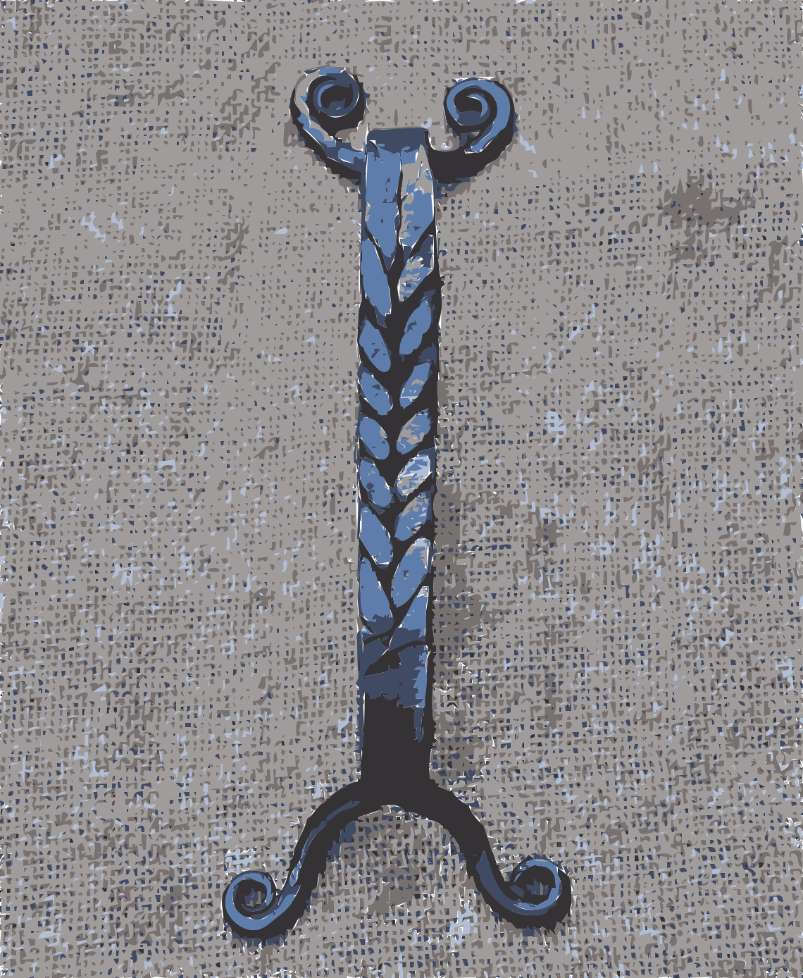 This features a unique metal piece with an ornate design, resembling a letter "I" or possibly a decorative handle. This artistic piece is mounted on a wall and appears to be made of iron. The intricate details in the design make it stand out as a distinctive feature in the room.