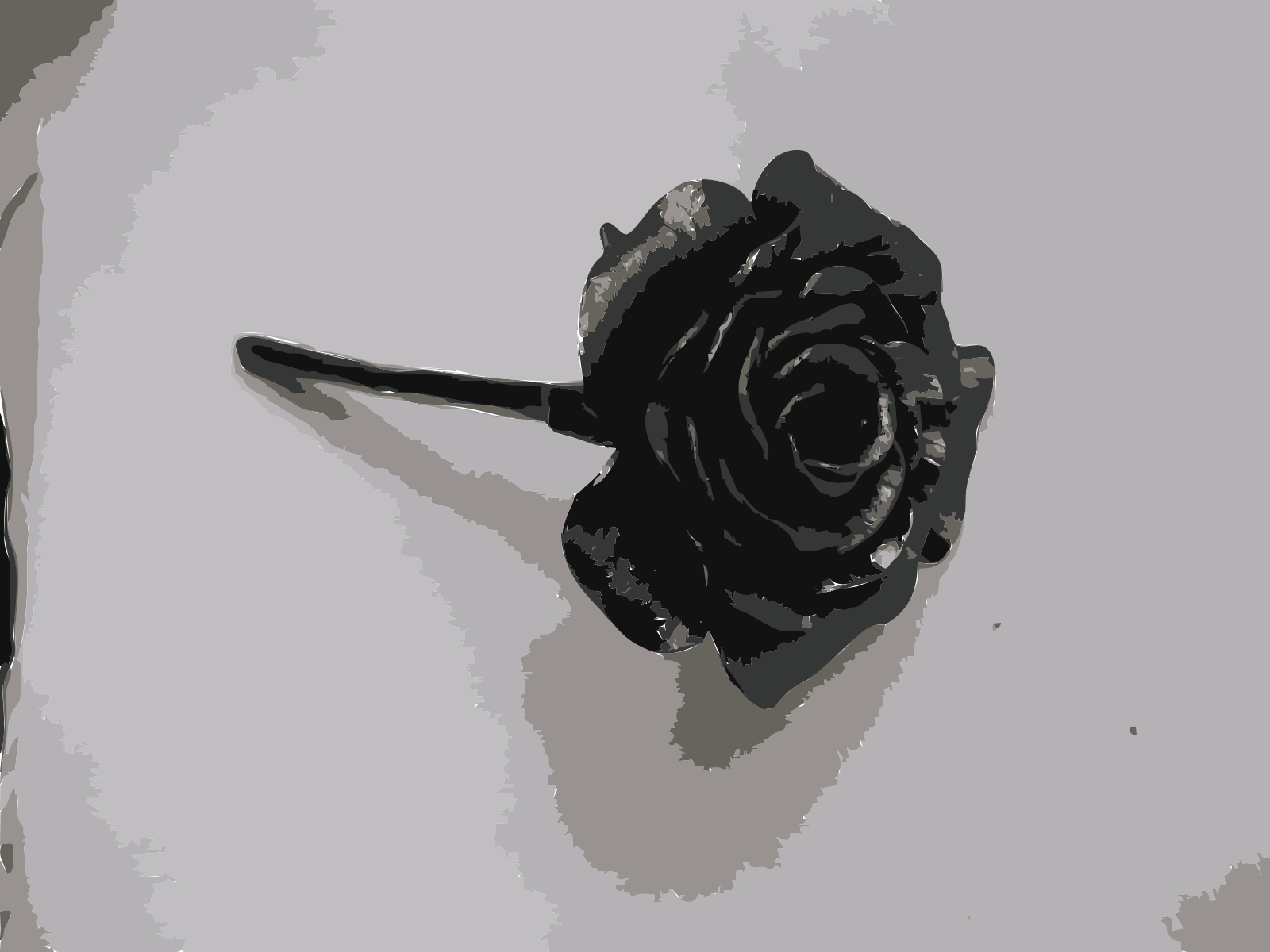 This features a black rose with a stem, placed on a white surface. The rose is the main focus of the scene and appears to be in good condition. The stem of the rose is also black, adding contrast to the overall appearance of the flower. This close-up view of the rose allows for a detailed examination of its features, making it an interesting subject for the viewer.