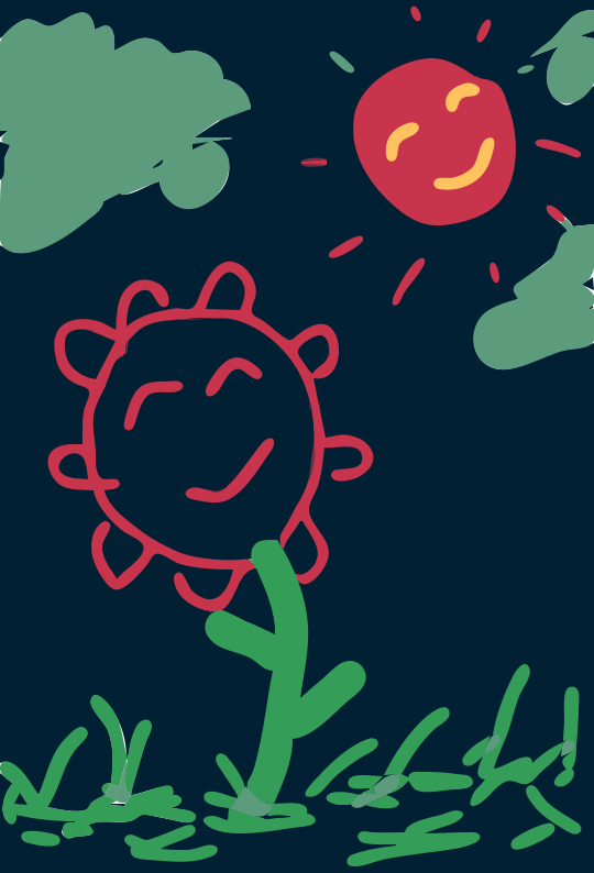 This features a red flower with a smiley face drawn on it, standing in the grass. The flower is positioned underneath a sun that has a smile painted on it, creating a cheerful and playful atmosphere. The scene appears to be set at night, as there are no other objects or people visible in the image.