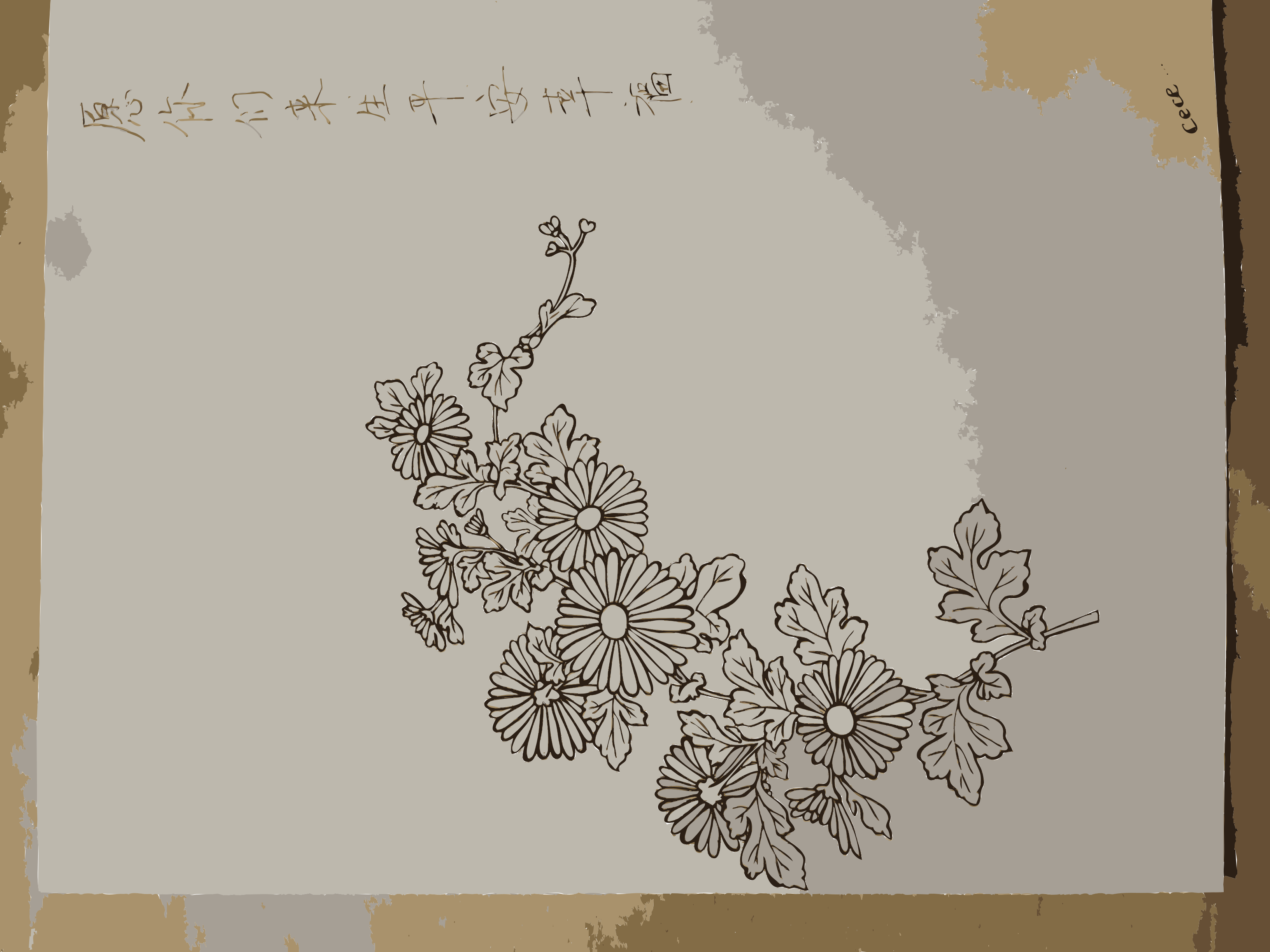 This features a beautifully drawn floral design on a piece of paper. The drawing is intricate and detailed, showcasing the artist's skill in capturing the delicate beauty of flowers. The paper appears to be old, giving it an antique feel. The artwork is likely inspired by Japanese culture, as evidenced by the use of flowers as a central theme. The floral design is adorned with various petals and leaves, creating a visually appealing composition that captures the essence of nature's beauty.