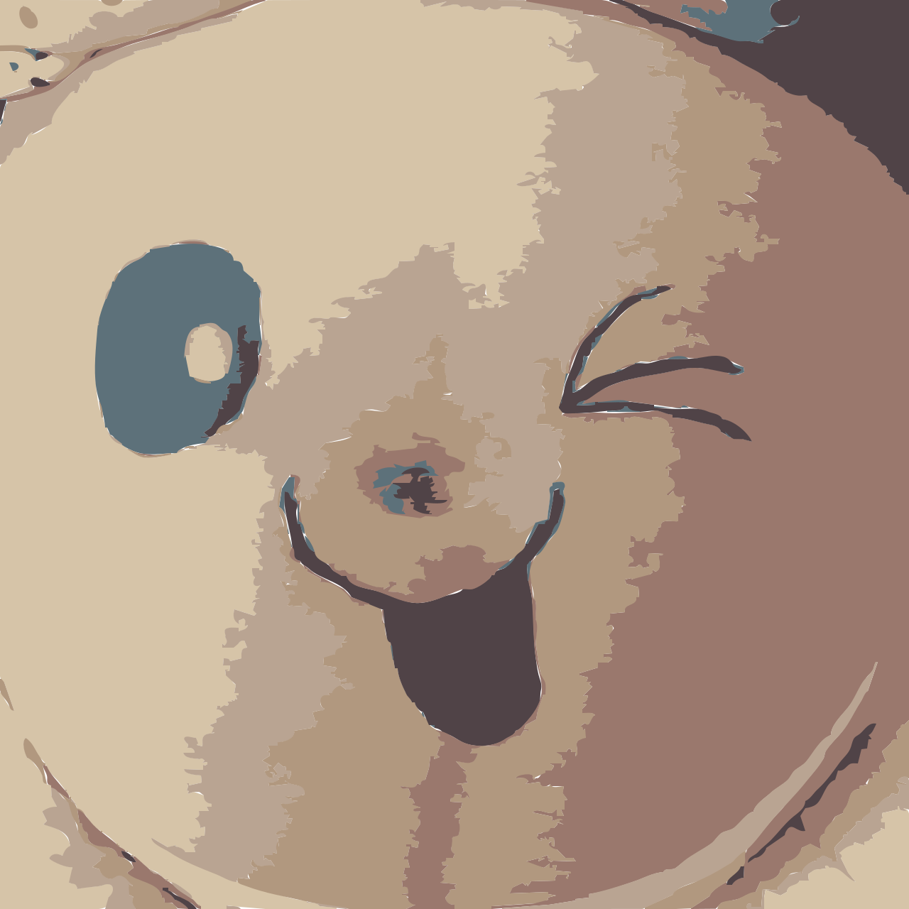 This features a large, round, and brown teddy bear with a big smile on its face. It has two blue eyes and a nose, giving it a friendly appearance. The teddy bear's mouth is open, showing teeth and tongue, adding to the playful nature of the character. This cute stuffed animal appears to be the main focus of the image, capturing attention with its charming expression.
