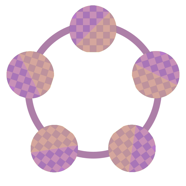 This features a purple circle with six smaller circles arranged around it. These smaller circles are placed at various positions within the larger circle, creating an interesting and visually appealing pattern. The colors of the circles vary from purple to brown, adding depth and contrast to the overall design. This unique arrangement of circles gives off a sense of unity while still maintaining individuality in each circle's position.