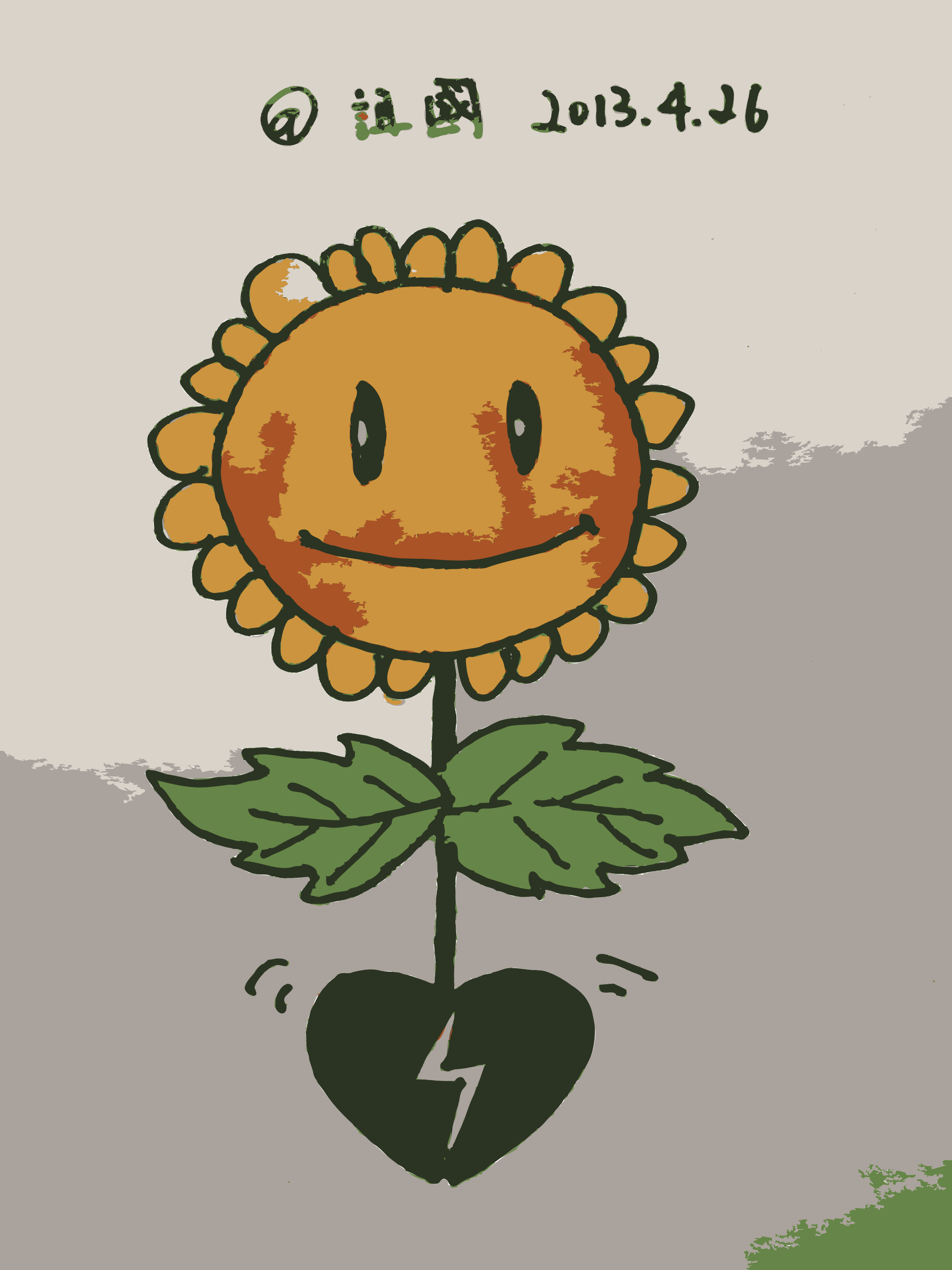 This features a colorful drawing of a smiling sunflower with a heart in the center. The sunflower is positioned on top of a leaf, giving it an adorable and cheerful appearance. The heart within the sunflower adds a touch of warmth to the scene. This artwork could be used as a decoration or a symbol for love and happiness.