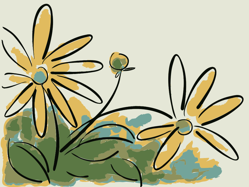 This features a beautifully drawn picture of two yellow flowers with green leaves, sitting in the grass. Each flower has a blue center and is surrounded by green leaves that add to the vibrant colors of the scene. The flowers are positioned close together, creating an eye-catching display. This artistic representation of nature showcases the beauty of these flowers and their surroundings.