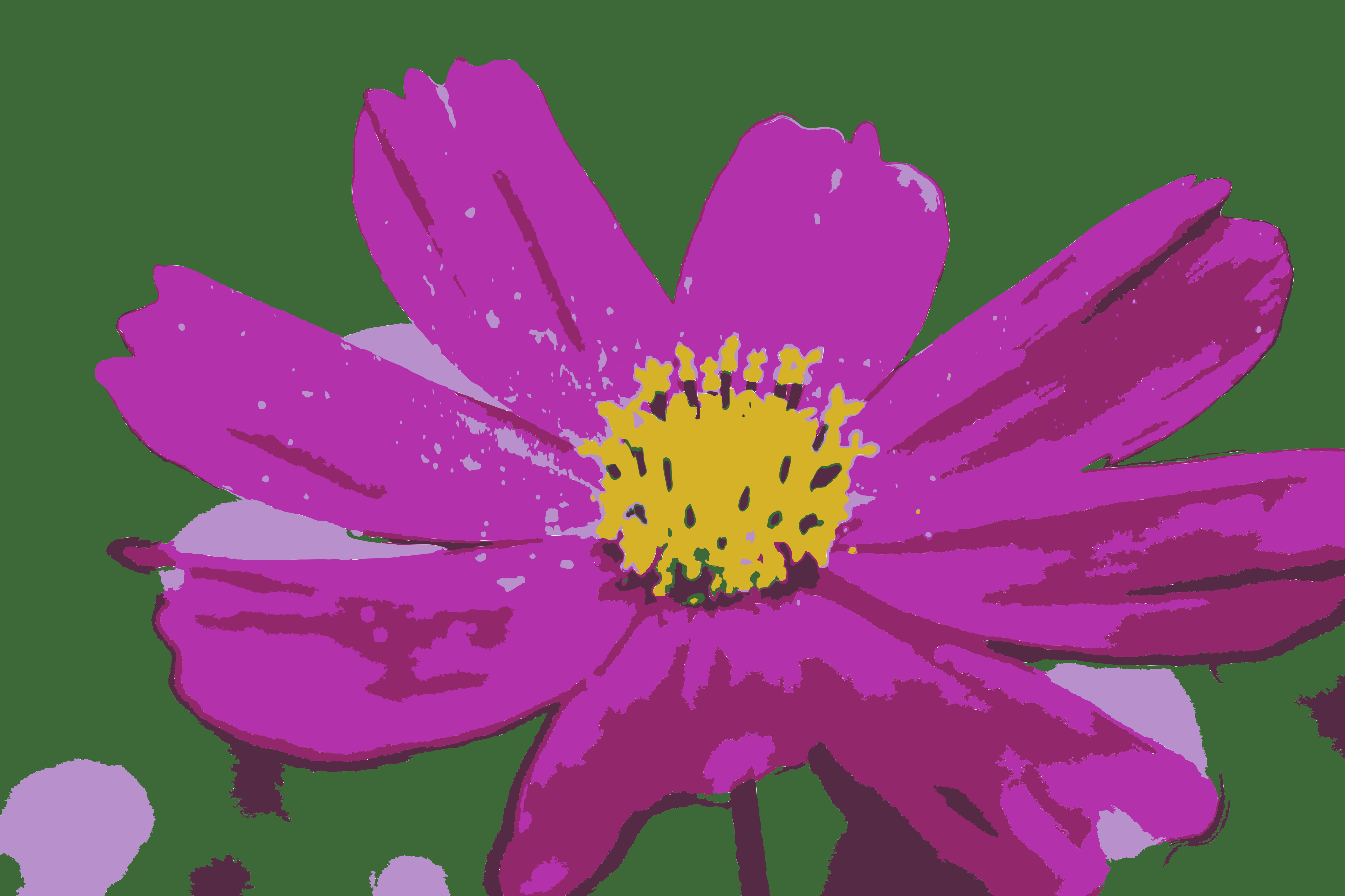 This features a purple flower with yellow pollen in the center, sitting on top of a green background. The flower is large and takes up most of the frame, making it the focal point of the picture. The vibrant colors of the flower create an eye-catching contrast against the green backdrop, drawing attention to its beauty. This image could be part of an artistic project or simply a captivating still life composition that highlights the natural beauty of flowers.