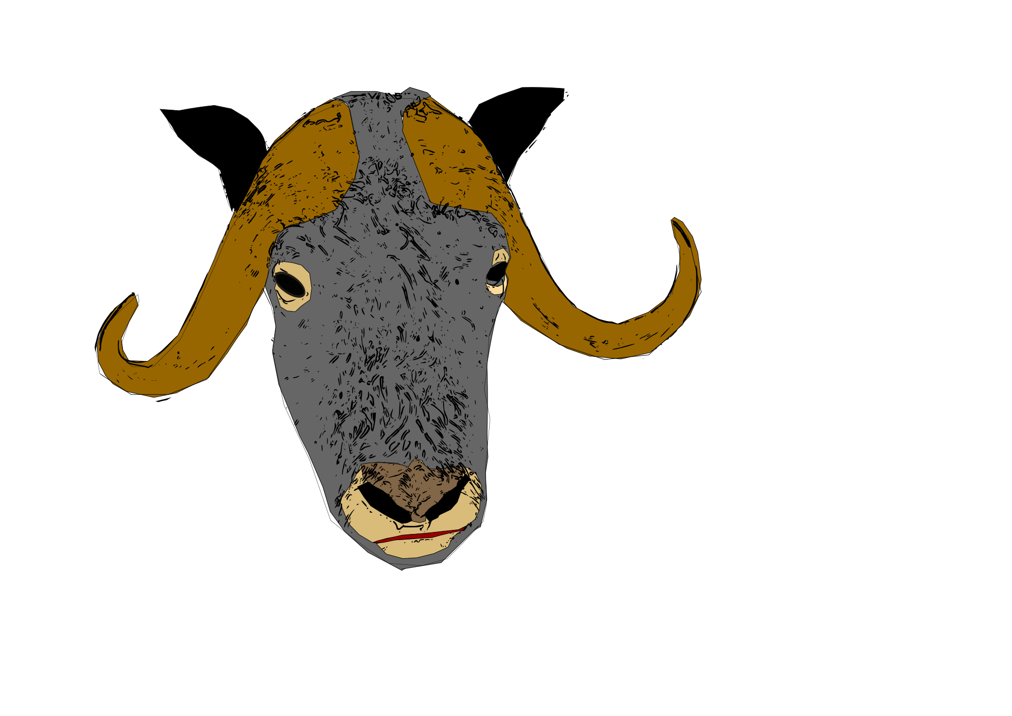 This features a close-up of an animal's head, possibly a buffalo or a ram. The head is prominently displayed in the foreground with its horns and ears clearly visible. The horns are large and curved, giving the impression that they could be used as weapons during battles. The animal appears to have a somewhat angry expression on its face, adding an interesting element of emotion to the image. Overall, it is a striking close-up of an intriguing creature with a unique appearance.