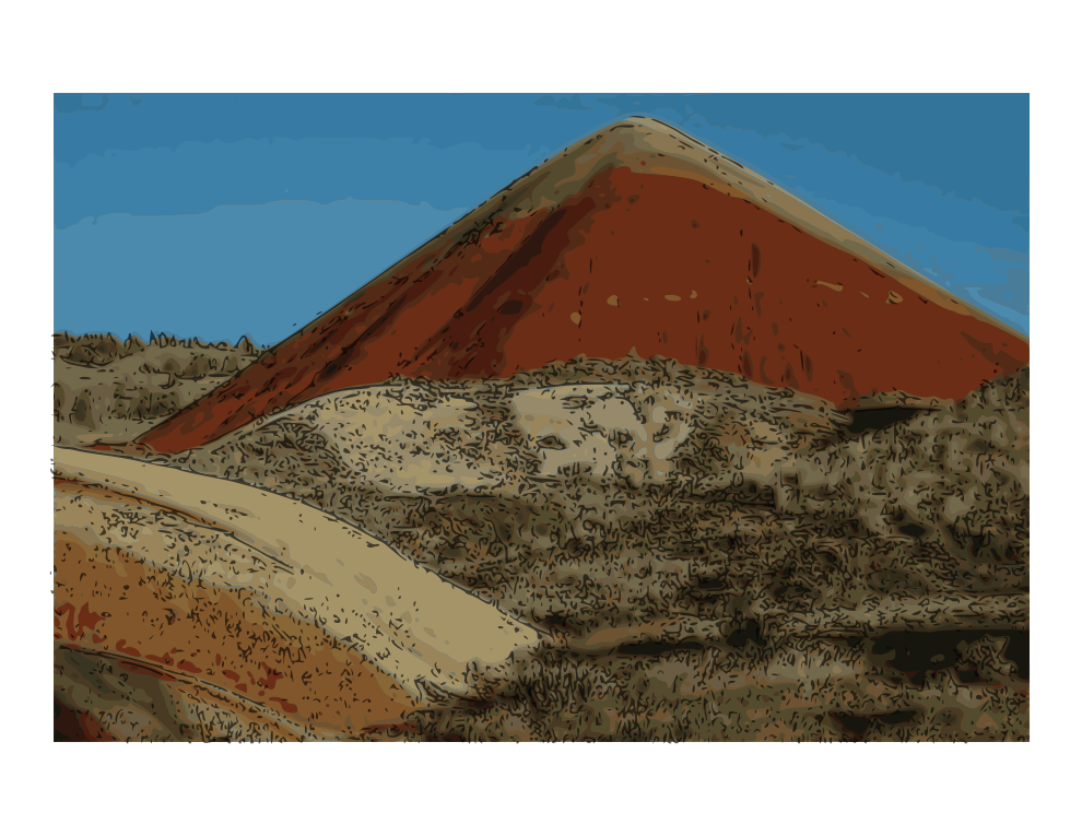 This features a large, red mountain with a cinder cone on top. It appears to be an artistic representation of the landscape, possibly in a colorful or stylized format. The mountain is situated next to a dirt road, which seems to lead towards it. The overall scene gives off a sense of adventure and exploration, as one might imagine traveling through this picturesque landscape.