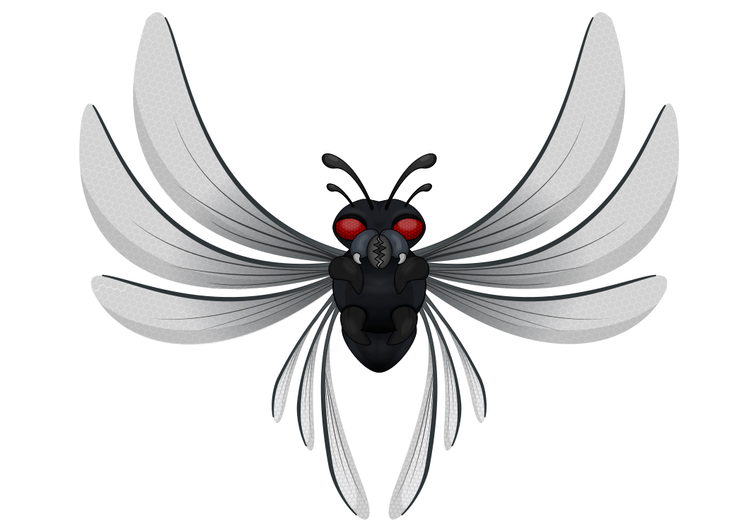 This features a black and gray illustration of a bee with red eyes. It is positioned in the center of the frame, occupying most of the space. The bee has several gray wings that are spread out, giving it an impressive appearance. Its body is predominantly black, while its wings have a mix of gray and black colors. The bee's red eyes stand out against the dark background, adding to the overall visual appeal of the illustration.