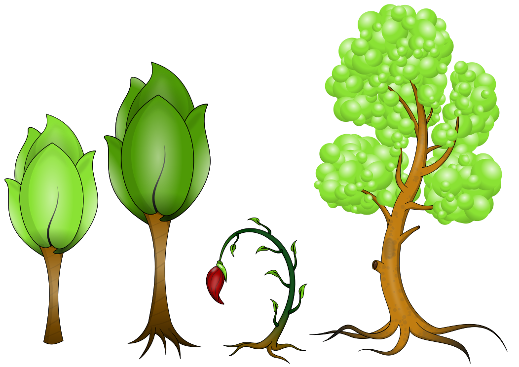 This features an illustration of four different plants growing, each at various stages in their development. Three of the plants have visible roots, while one is turning into a tree and another into a flower bud. The first plant on the left has a large root system, indicating that it is still in its early stages of growth. In contrast, the second plant on the right has a smaller root system, suggesting that it may be more mature or nearing completion. The third plant in the middle appears to be at an intermediate stage of development, with a moderate-sized root system. Overall, this image showcases the natural growth process and evolution of plants from their initial stages to full maturity.