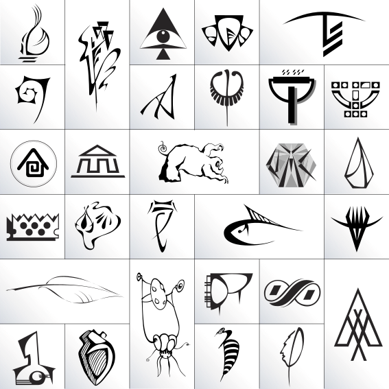 This displays a collection of various symbols arranged in six rows. These symbols are black and white, showcasing an array of different designs. Some of the symbols include a crown, a triangle, a circle with a dot inside, a cross, a heart, a star, a spade, a shield, a bullseye, a phoenix, a dragon, a snake, and a bird. The arrangement of these symbols creates an intriguing visual display that can be appreciated for its artistic value or used as inspiration for various projects.