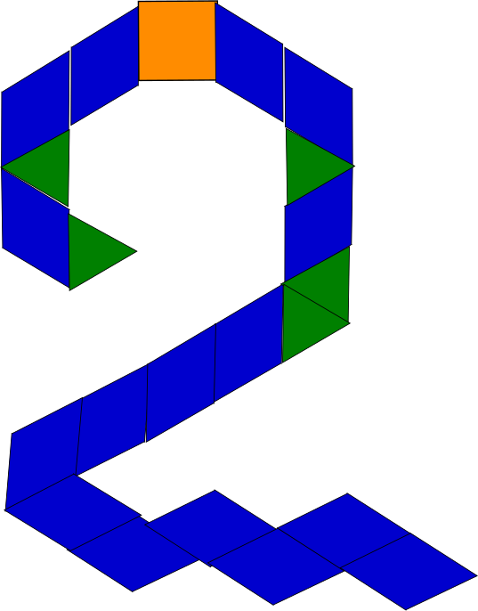 This features a blue and green geometric design that resembles the number two. It is composed of various shapes, including squares and triangles, arranged in an intricate pattern. The color scheme consists of shades of blue and green, with some orange accents adding contrast to the overall design. This unique artwork showcases creativity and attention to detail, making it a visually appealing piece that stands out from more traditional representations of numbers.