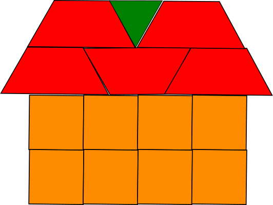 This features a unique and creative design of a house made up of various geometric shapes. These shapes are arranged in such a way that they form the structure of a house, giving it an interesting and artistic appearance. The house is predominantly orange in color, with some red accents adding to its vibrant look. The combination of these geometric shapes creates a visually appealing and imaginative representation of a home.