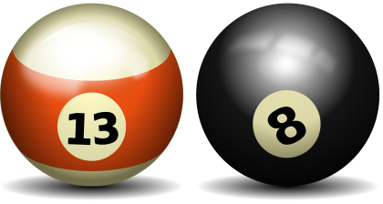 This features two billiard balls, one red and white with the number 13 in its center, and another black ball with the number 8 in its center. These balls are placed next to each other on a table, showcasing their contrasting colors and numbers. The red and white ball has an orange stripe around it, adding a touch of vibrancy to the scene. This image likely represents a game of pool or billiards, where players use these balls to strike and maneuver them across the table.