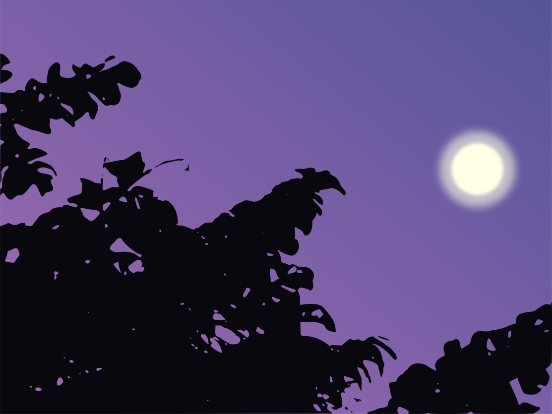 This features a beautiful nighttime scene with the moon shining brightly in the sky. A tree filled with leaves is prominently visible, casting its shadow on the ground below. The purple hue of the sky adds to the serene atmosphere of the scene. In addition to the main tree, there are several other trees scattered throughout the image, creating a sense of depth and dimension in the landscape. Overall, this captivating nighttime view showcases the beauty of nature and the tranquility of the moonlit sky.