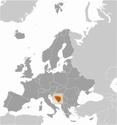 This is a map of Europe, featuring various countries and their borders. In the center of the map, there is a small red square that stands out from the rest of the map. This square represents the location of Bosnia and Herzegovina, which is a country in southeastern Europe. The map provides an overview of the region, highlighting its geographical features and political boundaries.