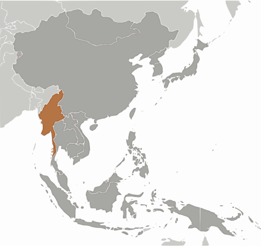 This is a map of the world with various countries and continents labeled. In the center, there is an area that appears to be Burma or Myanmar, which has a distinct orange color. This region stands out from the rest of the map due to its unique hue. The map also includes other countries such as India, China, Russia, and several others. Overall, it provides a comprehensive view of the world's geography with different regions highlighted in various colors.