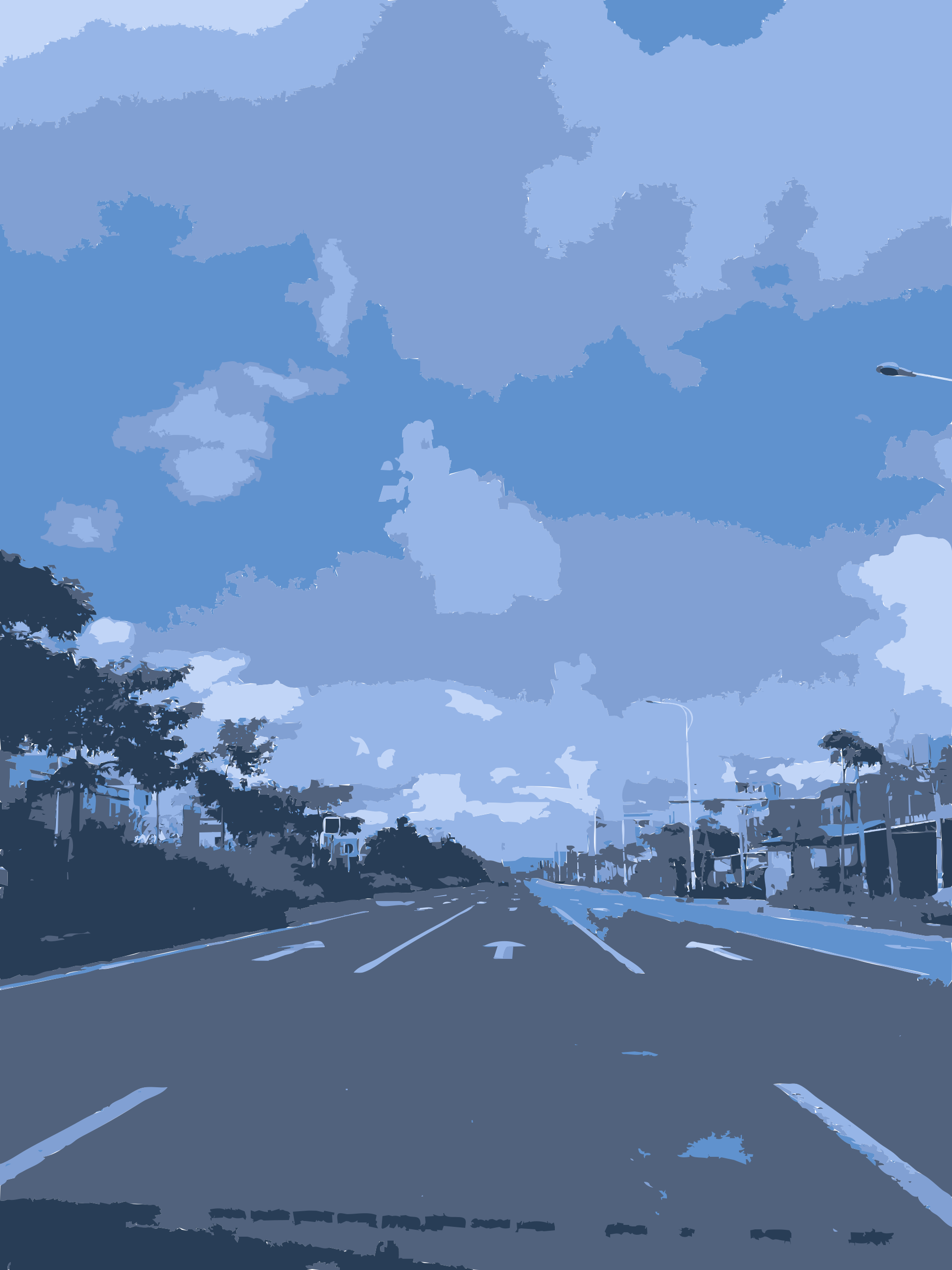 This depicts a city street on a cloudy day, with the sky appearing blue and overcast. There are several cars driving down the road, including one car in the foreground and others further back. A traffic light can be seen near the center of the scene, indicating that this is an urban environment. The overall atmosphere suggests a typical day in a city, with people going about their daily routines despite the cloudy weather.