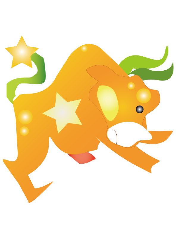 This features a cartoon cow with an orange body and large star in the center. It has green horns, a tail with a golden star at the tip, and a white mouth. The cow appears to be charging forward, giving it a dynamic and playful appearance. This whimsical illustration could be used for various purposes such as children's books or educational materials, where the cow serves as an engaging character that captures the viewer's attention.