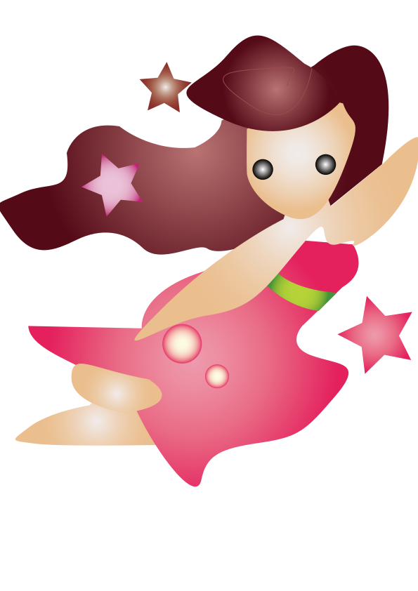 This features a young girl in a pink dress with a green belt, flying through the air. She has dark brown hair and is adorned with three pink stars around her. Her outfit appears to be a combination of a costume and a casual dress, giving her an elegant yet playful appearance. The girl's pose suggests that she is enjoying herself as she soars through the air, possibly in a fantasy or imaginative setting.