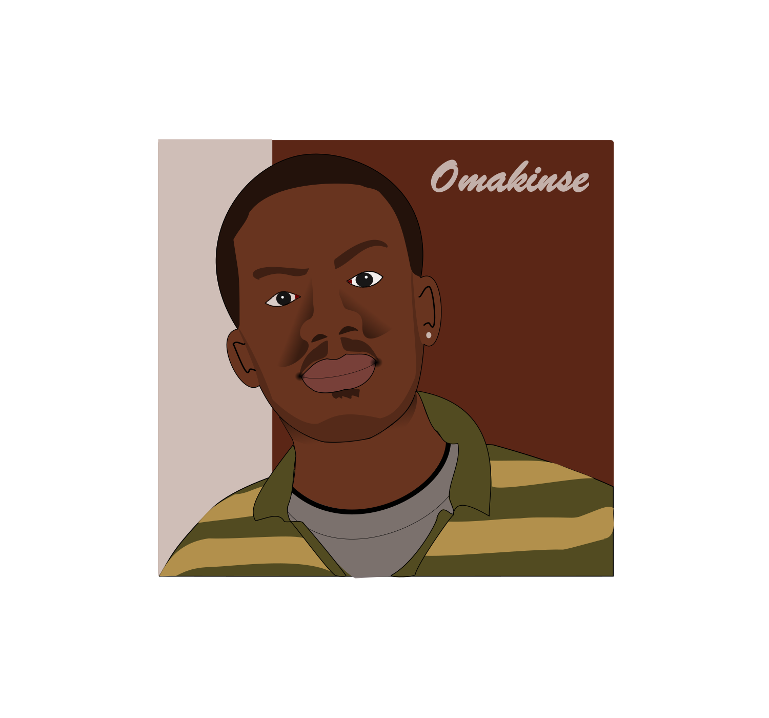 This features a man with dark brown skin, wearing a ring and a white and yellow polo-shirt. He is also wearing a grey t-shirt underneath. His expression appears to be serious as he stares directly into the camera. The background of the image has "Omakinse" written on it in dark and light brown colors, giving the photo an artistic touch.