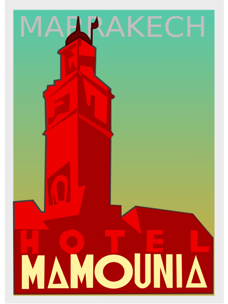 This features a red and yellow poster advertising the Hotel Mamounia. The hotel is prominently displayed on the poster, with its name written in large letters. The colors of the poster are predominantly red and yellow, creating an eye-catching design. In addition to the hotel's name, there is also a clock visible on the poster, likely indicating the time for potential guests. Overall, the poster effectively showcases the Hotel Mamounia as a desirable destination for travelers.