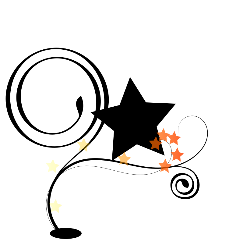 This features a black and white star with a flourish, which is the main focus of the picture. The star has a swirly design around it, adding an artistic touch to its appearance. In addition to the main star, there are several smaller stars scattered throughout the scene, creating a sense of depth and dimension. These smaller stars come in various sizes and positions, contributing to the overall visual interest of the image. The combination of the large black and white star with the surrounding smaller stars creates an eye-catching and unique design that stands out against its background.