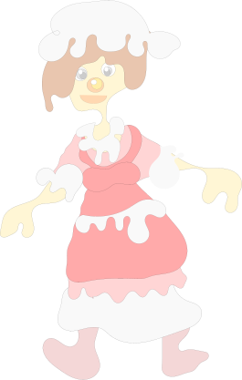 This features a cartoon character, possibly a woman or a girl, wearing a pink dress with white frosting on it. She appears to be walking and has a playful expression on her face. The frosting adds a fun and whimsical touch to the character's appearance. The overall scene is colorful and engaging, likely intended for entertainment or as part of an artistic project.