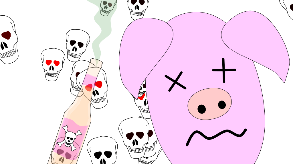 This features a pink cartoon pig with a cigarette in its mouth, surrounded by numerous skeleton heads. These skeletons are scattered all around the pig, creating an eerie and unsettling atmosphere. In addition to the skeletons, there is also a bottle of beer present in the scene, further adding to the drunken nightmare theme. The combination of the pink cartoon pig, the cigarette, and the numerous skeleton heads creates an interesting and somewhat disturbing visual.