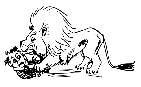 This features a lion standing on top of another animal, which appears to be a dog. The lion is in the process of eating its prey, with its mouth open and showing teeth. The dog seems to be trying to defend itself from the lion's attack. In addition to the main scene, there are two more figures present in the image - one on the left side and another on the right side. These figures appear to be smaller than the main subjects and may not have a significant role in the overall composition of the picture.