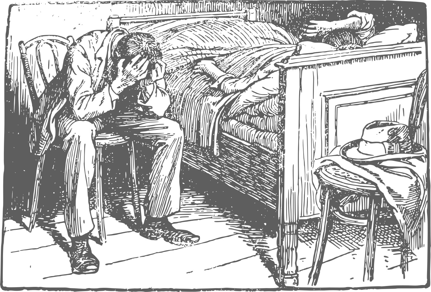 This is a black and white illustration of a man sitting next to a woman lying in bed. The woman appears to be sick, as she is covered with blankets. The man has his hands on his head, showing signs of distress or concern for the woman's condition. There are also two chairs visible in the scene, one near the man and another further away from him. Additionally, there is a book placed close to the bed, possibly indicating that the couple was reading together before the woman fell ill.