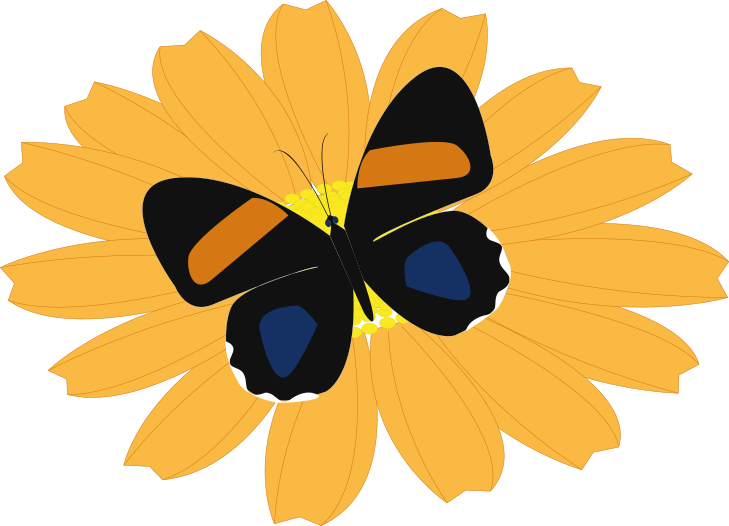 This features a yellow sunflower with an orange center, adorned by the presence of a black and blue butterfly. The butterfly is perched on top of the flower, creating a visually appealing scene. The butterfly's wings are decorated in orange and blue patterns, adding to its beauty. This image captures the essence of nature, showcasing the harmony between the vibrant yellow sunflower and the delicate black and blue butterfly.