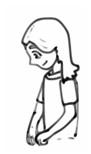 This features a cartoon drawing of a girl with long hair, wearing a white shirt. She is looking down and smiling at the viewer. The drawing appears to be hand-drawn, giving it an artistic and unique appearance. The girl's expression and posture suggest that she might be posing for a picture or simply enjoying her time. Overall, this image captures a cheerful and friendly atmosphere with its charming cartoon character.